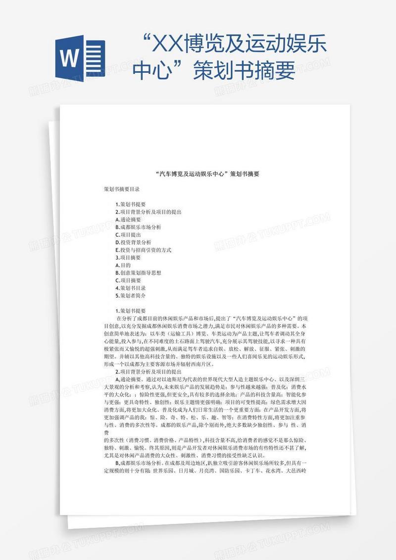 本作品为“XX博览及运动娱乐中心”策划书摘要, 编号:daen3jmk2a, 格式为 doc, 大小1 MB, 本作品下载后,先解压,解压之后用推荐软件 Word(2010) 打开, 然后进行编辑功能。
