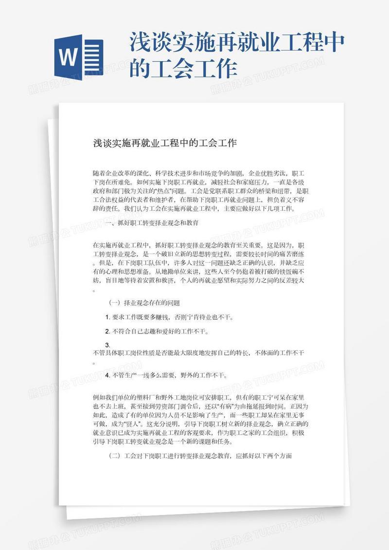 本作品为浅谈实施再就业工程中的工会工作, 编号:daen75252a, 格式为 docx, 大小1 MB, 本作品下载后,先解压,解压之后用推荐软件 Word(2010) 打开, 然后进行编辑功能。