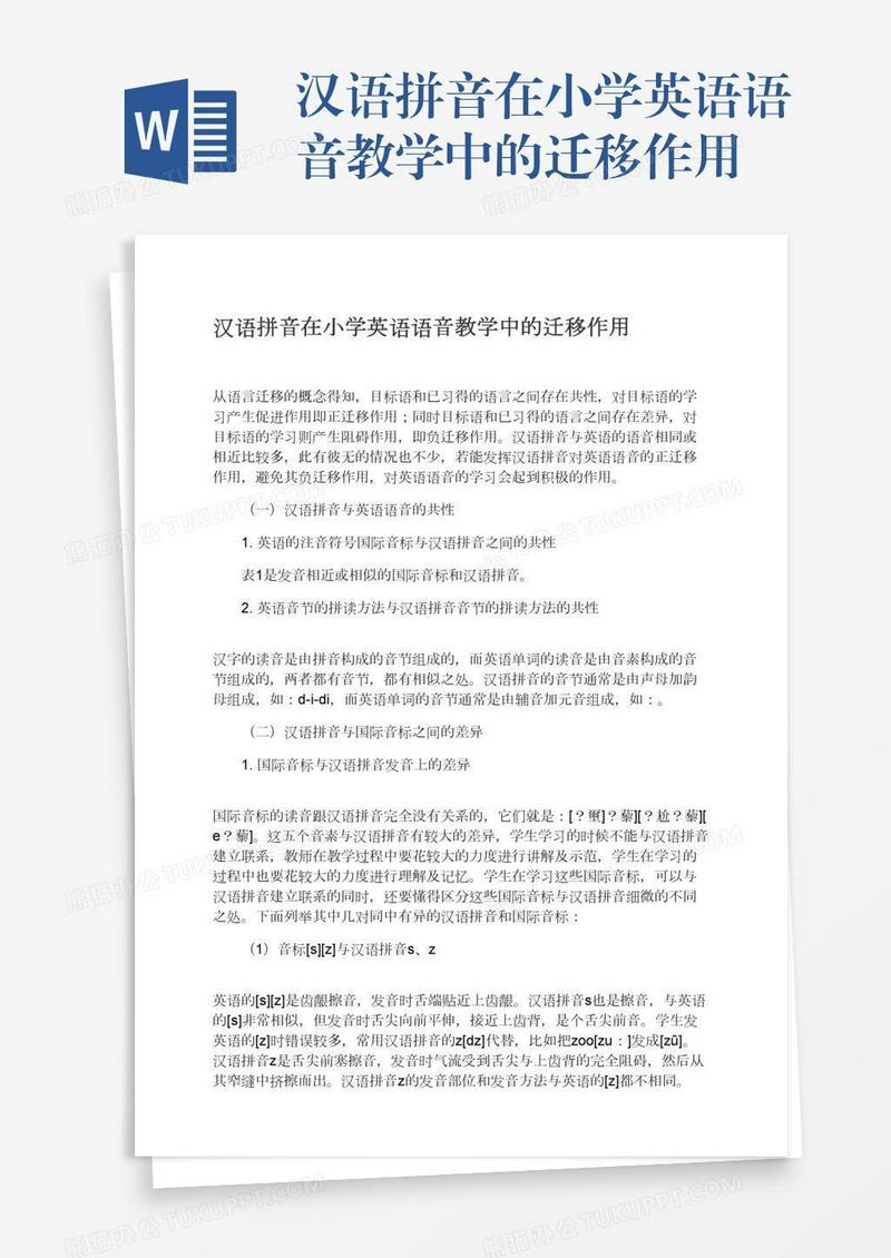 本作品为汉语拼音在小学英语语音教学中的迁移作用, 编号:daen7547da, 格式为 docx, 大小1 MB, 本作品下载后,先解压,解压之后用推荐软件 Word(2010) 打开, 然后进行编辑功能。