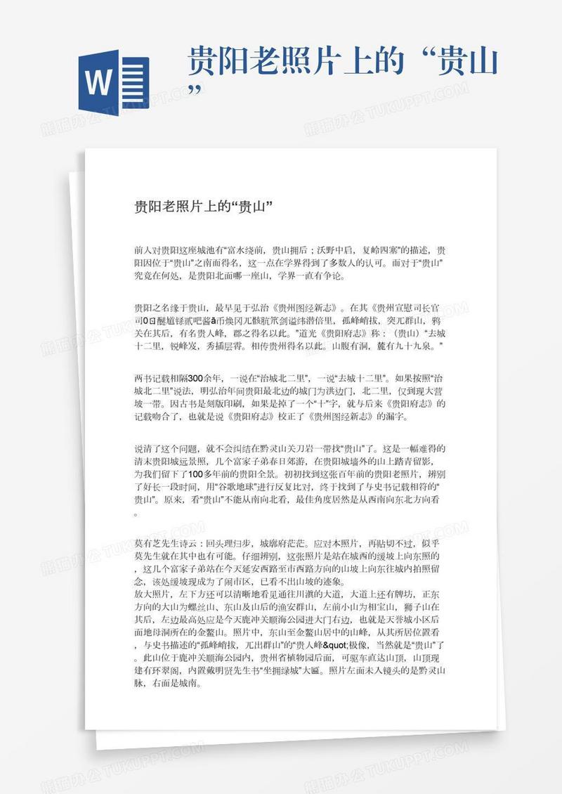 本作品为贵阳老照片上的“贵山”, 编号:daen7rrgba, 格式为 docx, 大小1 MB, 本作品下载后,先解压,解压之后用推荐软件 Word(2010) 打开, 然后进行编辑功能。