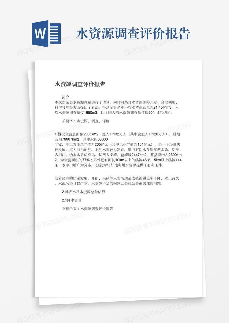 本作品为水资源调查评价报告, 编号:daen7wkrra, 格式为 docx, 大小1 MB, 本作品下载后,先解压,解压之后用推荐软件 Word(2010) 打开, 然后进行编辑功能。