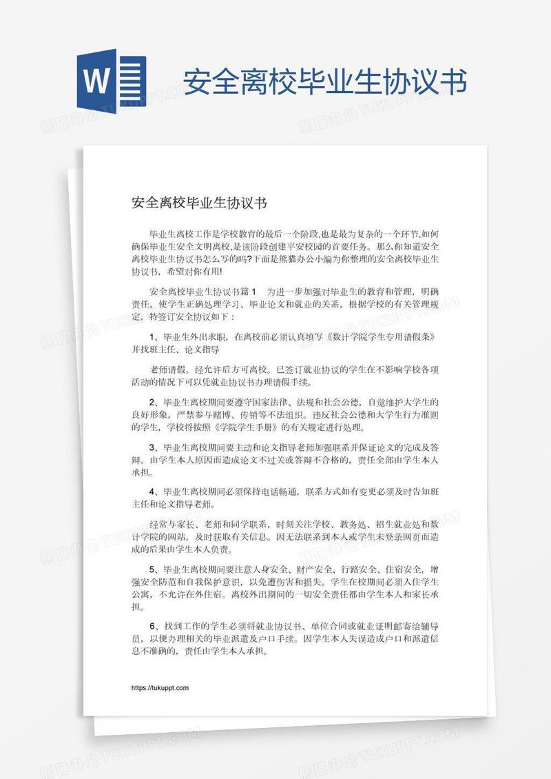 本作品为安全离校毕业生协议书, 编号:daenw36wva, 格式为 docx, 大小1 MB, 本作品下载后,先解压,解压之后用推荐软件 Word(2010) 打开, 然后进行编辑功能。