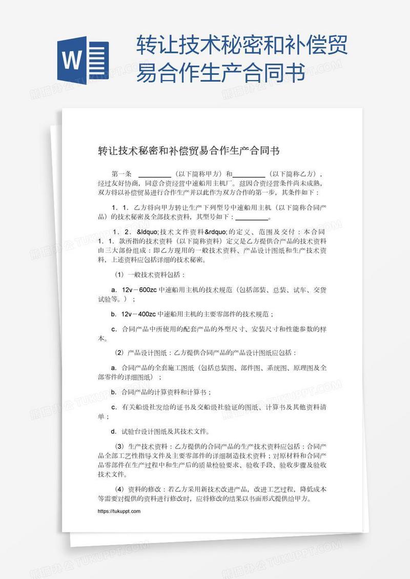 本作品为转让技术秘密和补偿贸易合作生产合同书, 编号:daenw3yq2a, 格式为 docx, 大小1 MB, 本作品下载后,先解压,解压之后用推荐软件 Word(2010) 打开, 然后进行编辑功能。