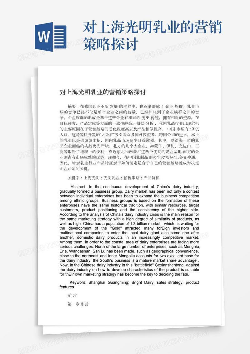 本作品为对上海光明乳业的营销策略探讨, 编号:daenwek4ra, 格式为 docx, 大小1 MB, 本作品下载后,先解压,解压之后用推荐软件 Word(2010) 打开, 然后进行编辑功能。