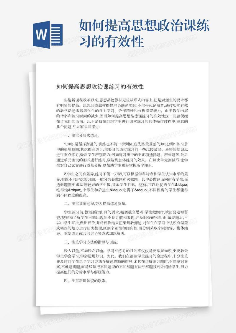 本作品为如何提高思想政治课练习的有效性, 编号:daenwel8da, 格式为 docx, 大小1 MB, 本作品下载后,先解压,解压之后用推荐软件 Word(2010) 打开, 然后进行编辑功能。