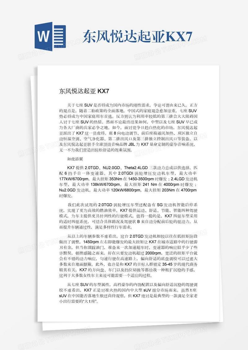 本作品为东风悦达起亚KX7, 编号:daenwm0p2a, 格式为 docx, 大小1 MB, 本作品下载后,先解压,解压之后用推荐软件 Word(2010) 打开, 然后进行编辑功能。