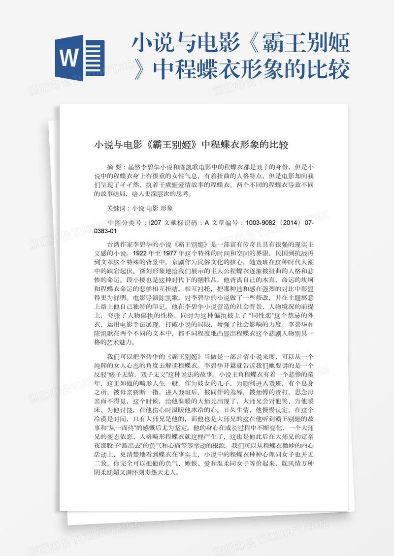 本作品为小说与电影《霸王别姬》中程蝶衣形象的比较, 编号:daenwmm8pa, 格式为 docx, 大小1 MB, 本作品下载后,先解压,解压之后用推荐软件 Word(2010) 打开, 然后进行编辑功能。