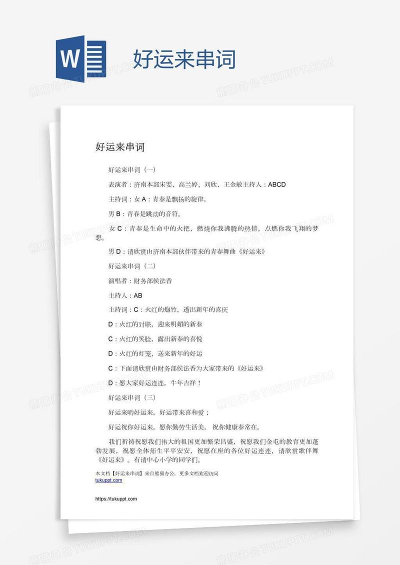 本作品为好运来串词, 编号:daenwor6ra, 格式为 docx, 大小1 MB, 本作品下载后,先解压,解压之后用推荐软件 Word(2010) 打开, 然后进行编辑功能。