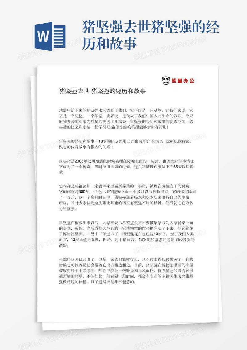 本作品为猪坚强去世猪坚强的经历和故事, 编号:daenwp28da, 格式为 docx, 大小1 MB, 本作品下载后,先解压,解压之后用推荐软件 Word(2010) 打开, 然后进行编辑功能。