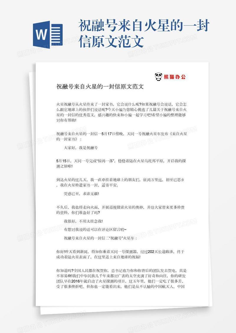 本作品为祝融号来自火星的一封信原文范文, 编号:daenwp6eba, 格式为 docx, 大小1 MB, 本作品下载后,先解压,解压之后用推荐软件 Word(2010) 打开, 然后进行编辑功能。