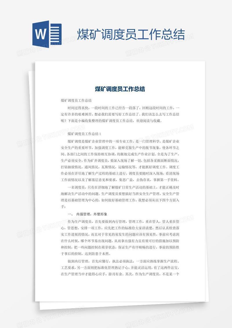 本作品为煤矿调度员工作总结, 编号:daenwr6jpa, 格式为 doc, 大小1 MB, 本作品下载后,先解压,解压之后用推荐软件 Word(2010) 打开, 然后进行编辑功能。