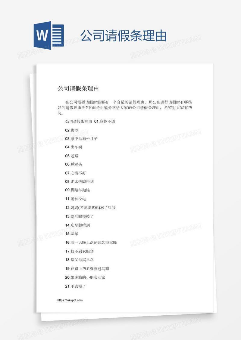 本作品为公司请假条理由, 编号:daenwrnbva, 格式为 docx, 大小1 MB, 本作品下载后,先解压,解压之后用推荐软件 Word(2010) 打开, 然后进行编辑功能。