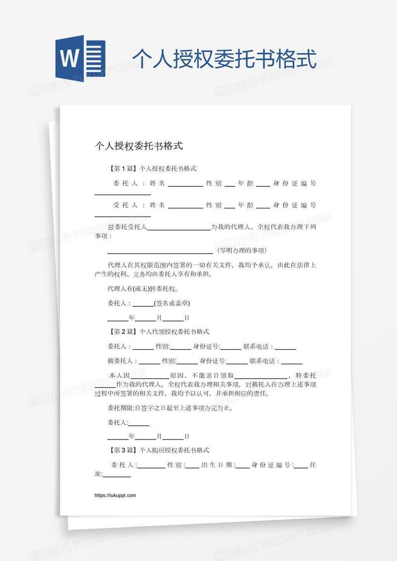 本作品为个人授权委托书格式, 编号:daenwwqqra, 格式为 docx, 大小1 MB, 本作品下载后,先解压,解压之后用推荐软件 Word(2010) 打开, 然后进行编辑功能。