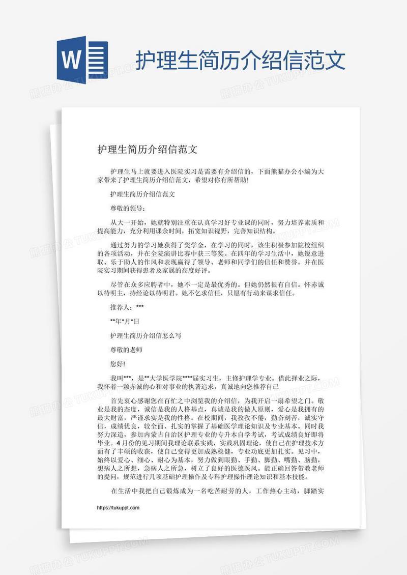 本作品为护理生简历介绍信范文, 编号:daenwy8wda, 格式为 docx, 大小1 MB, 本作品下载后,先解压,解压之后用推荐软件 Word(2010) 打开, 然后进行编辑功能。