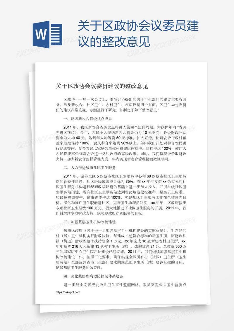 本作品为关于区政协会议委员建议的整改意见, 编号:daenwyv22a, 格式为 docx, 大小1 MB, 本作品下载后,先解压,解压之后用推荐软件 Word(2010) 打开, 然后进行编辑功能。