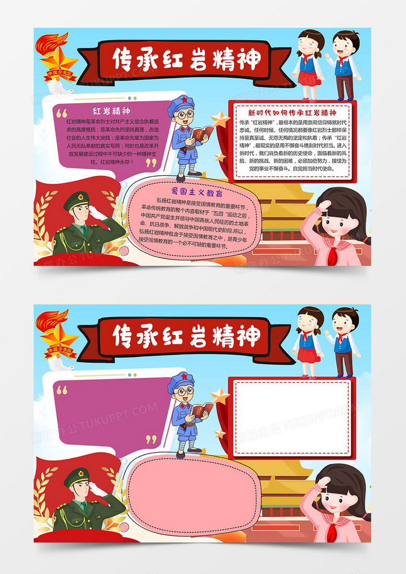本作品为传承红岩精神爱国小报word模板, 编号:dawm20brm1, 格式为 wps, 大小10 MB, 本作品下载后,先解压,解压之后用推荐软件 Word(2019) 打开, 然后进行编辑功能。