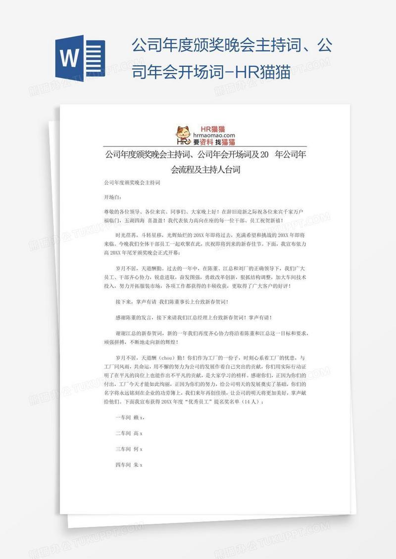 本作品为公司年度颁奖晚会主持词、公司年会开场词-HR猫猫, 编号:dawm27wd41, 格式为 doc, 大小1 MB, 本作品下载后,先解压,解压之后用推荐软件 Word(2010) 打开, 然后进行编辑功能。
