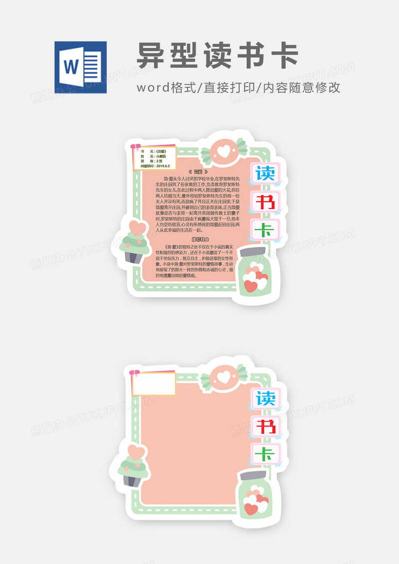 本作品为可爱糖果清新风异型读书卡word模板, 编号:dawm284241, 格式为 docx, 大小1 MB, 本作品下载后,先解压,解压之后用推荐软件 Word(2010) 打开, 然后进行编辑功能。