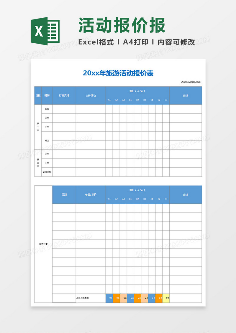 本作品为简约实用旅游报价表excel表格模板, 编号:dawm2kdvy1, 格式为 xls, 大小1 MB, 本作品下载后,先解压,解压之后用推荐软件 Excel(2016) 打开, 然后进行编辑功能。