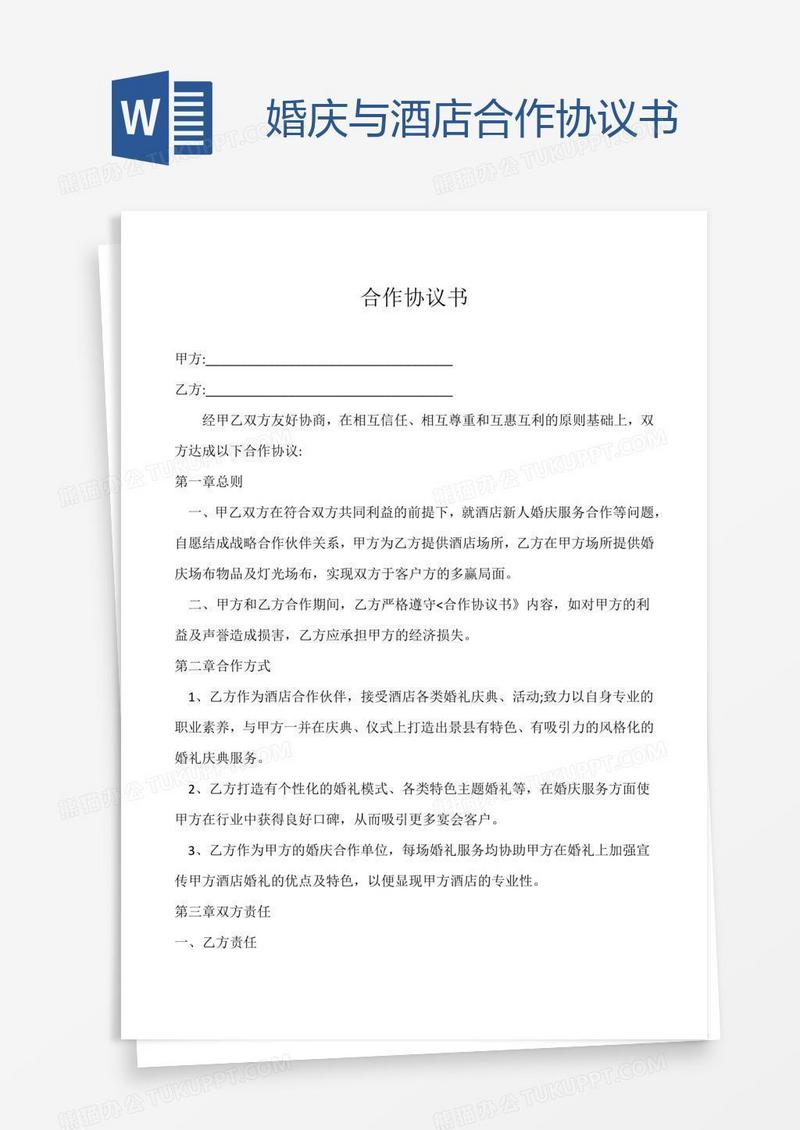 本作品为婚庆与酒店合作协议书, 编号:dawm2n2261, 格式为 docx, 大小1 MB, 本作品下载后,先解压,解压之后用推荐软件 Word(2010) 打开, 然后进行编辑功能。