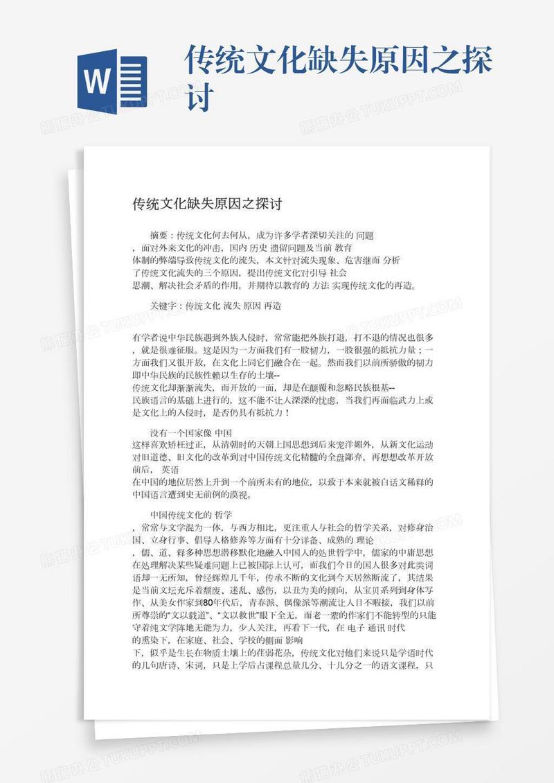 本作品为传统文化缺失原因之探讨, 编号:dawm627yy1, 格式为 docx, 大小1 MB, 本作品下载后,先解压,解压之后用推荐软件 Word(2010) 打开, 然后进行编辑功能。