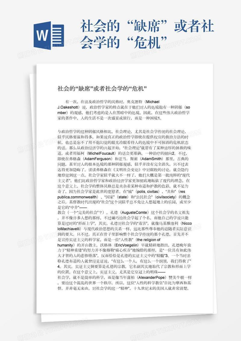 本作品为社会的“缺席”或者社会学的“危机”, 编号:dawm62lvd1, 格式为 docx, 大小1 MB, 本作品下载后,先解压,解压之后用推荐软件 Word(2010) 打开, 然后进行编辑功能。