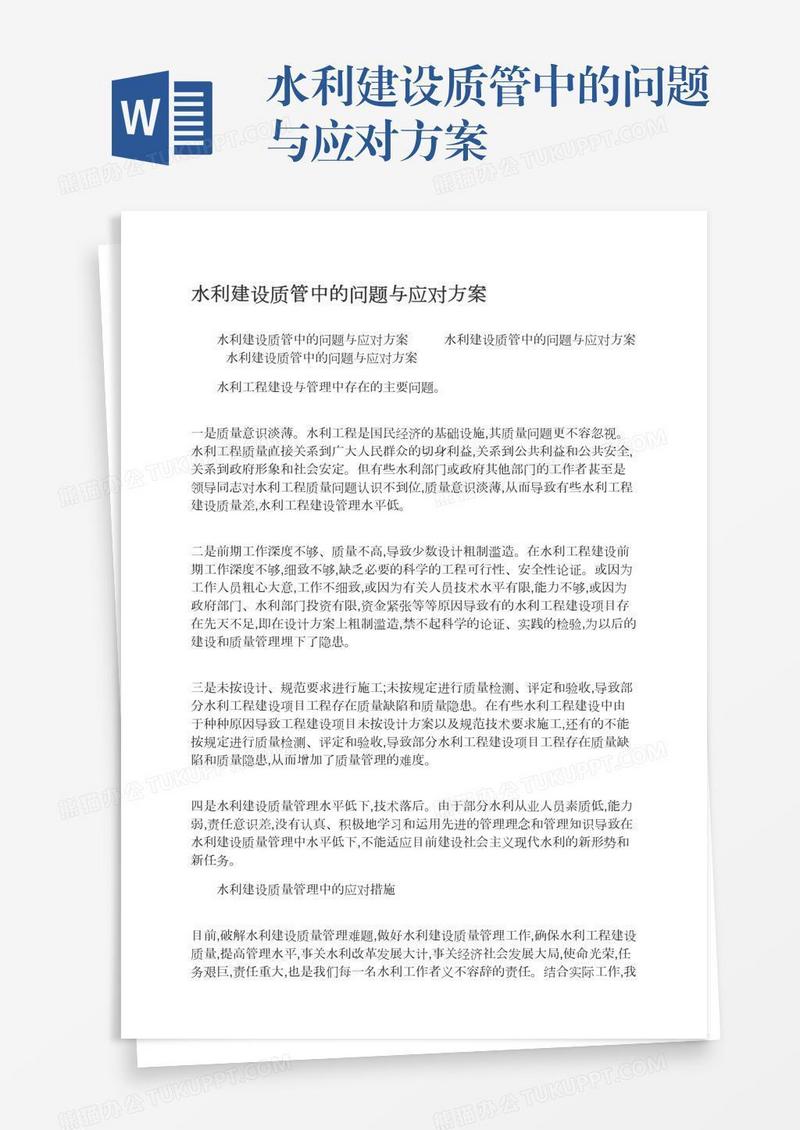 本作品为水利建设质管中的问题与应对方案, 编号:dawm6kkjm1, 格式为 docx, 大小1 MB, 本作品下载后,先解压,解压之后用推荐软件 Word(2010) 打开, 然后进行编辑功能。