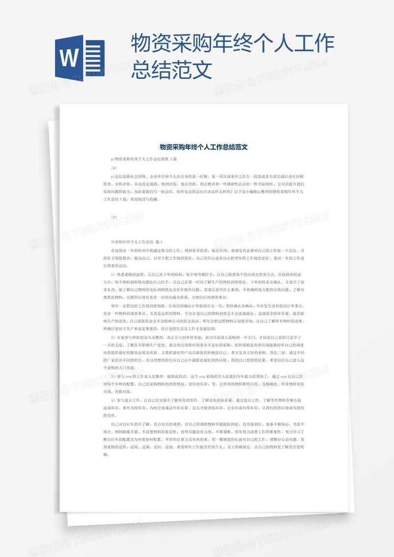 本作品为物资采购年终个人工作总结范文, 编号:dawmk2b6m1, 格式为 doc, 大小1 MB, 本作品下载后,先解压,解压之后用推荐软件 Word(2010) 打开, 然后进行编辑功能。