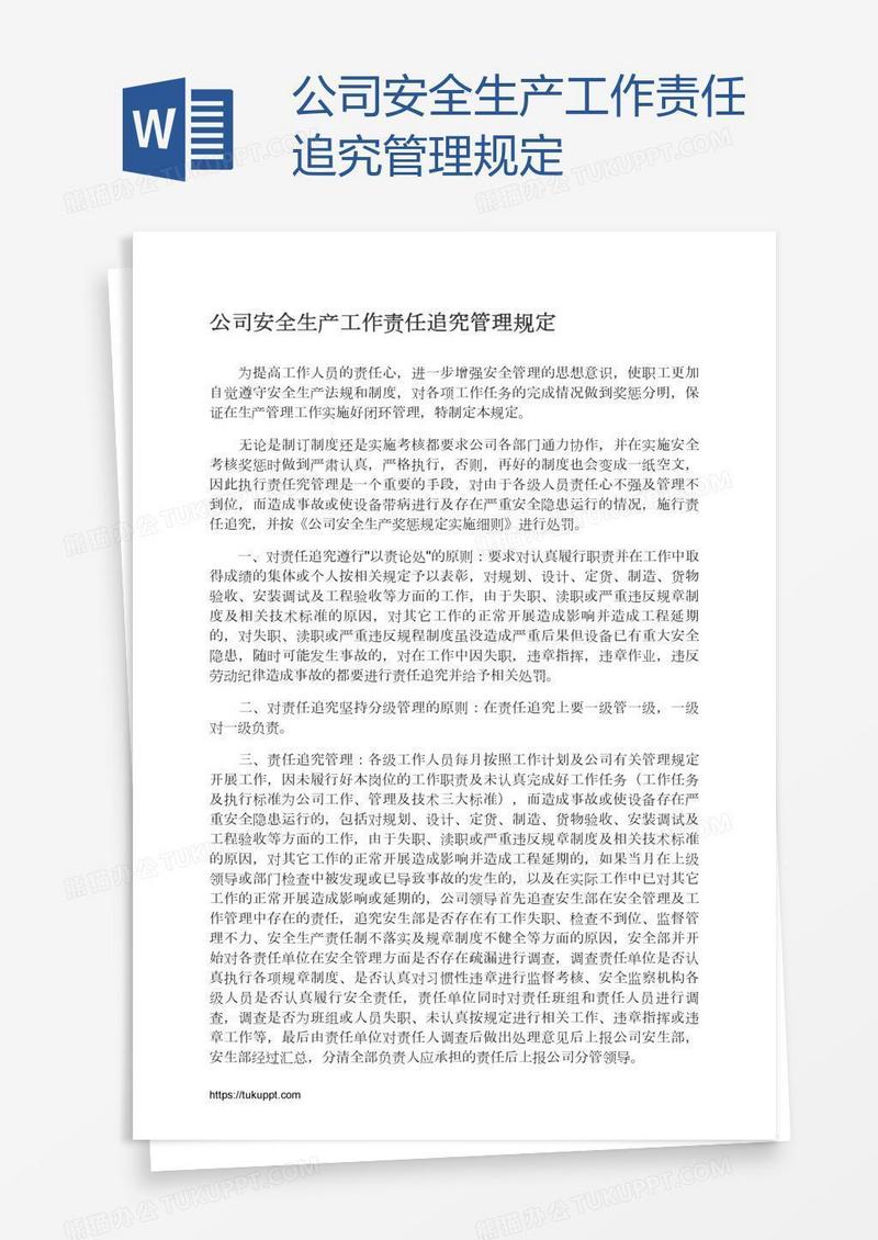 本作品为公司安全生产工作责任追究管理规定, 编号:dawmk37m81, 格式为 docx, 大小1 MB, 本作品下载后,先解压,解压之后用推荐软件 Word(2010) 打开, 然后进行编辑功能。