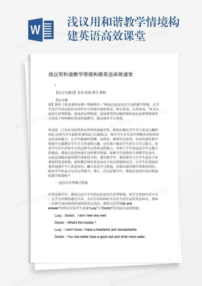本作品为浅议用和谐教学情境构建英语高效课堂, 编号:dawmk5yy81, 格式为 docx, 大小1 MB, 本作品下载后,先解压,解压之后用推荐软件 Word(2010) 打开, 然后进行编辑功能。