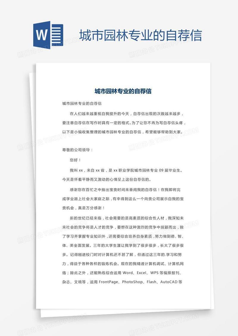 本作品为城市园林专业的自荐信, 编号:dawmkjbbm1, 格式为 docx, 大小1 MB, 本作品下载后,先解压,解压之后用推荐软件 Word(2010) 打开, 然后进行编辑功能。