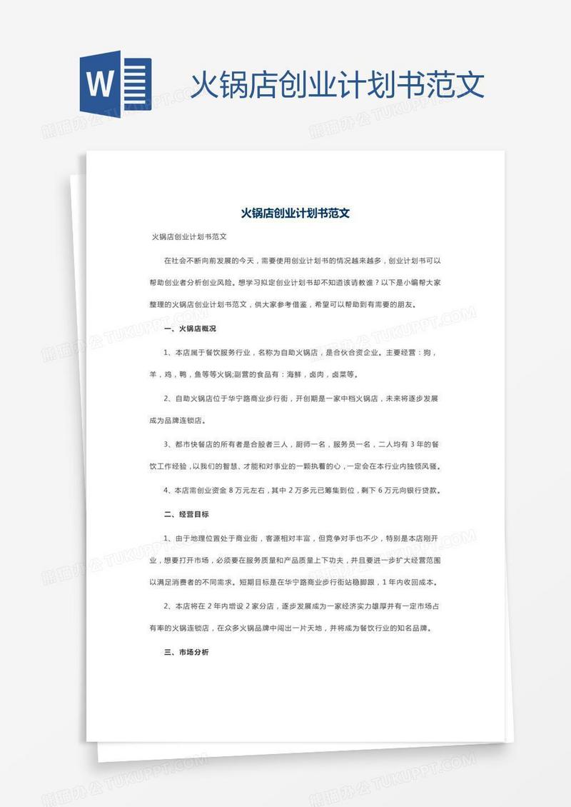 本作品为火锅店创业计划书范文, 编号:dawmknq0d1, 格式为 docx, 大小1 MB, 本作品下载后,先解压,解压之后用推荐软件 Word(2010) 打开, 然后进行编辑功能。