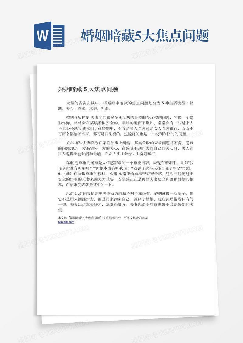 本作品为婚姻暗藏5大焦点问题, 编号:dawmkvn8m1, 格式为 docx, 大小1 MB, 本作品下载后,先解压,解压之后用推荐软件 Word(2010) 打开, 然后进行编辑功能。