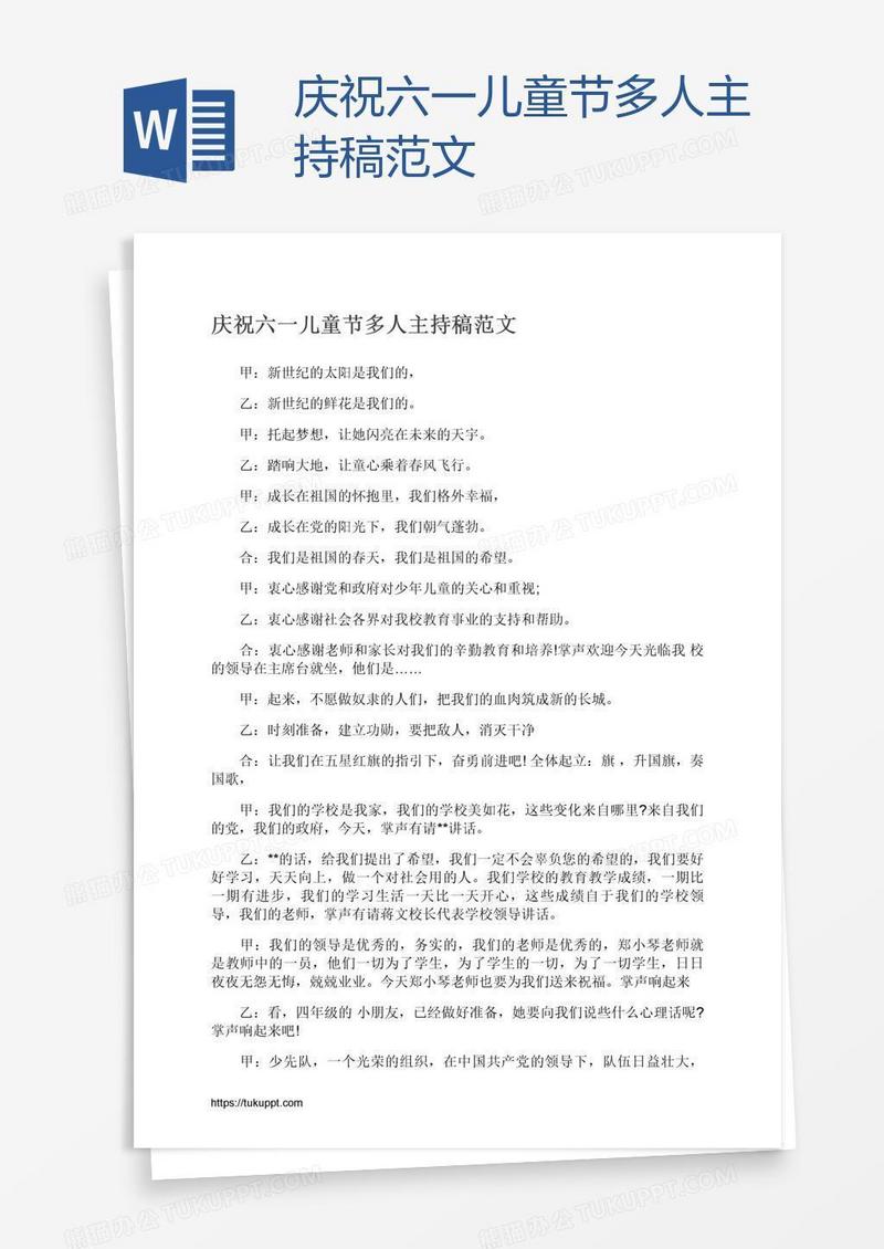 本作品为庆祝六一儿童节多人主持稿范文, 编号:dawmkw5w61, 格式为 docx, 大小1 MB, 本作品下载后,先解压,解压之后用推荐软件 Word(2010) 打开, 然后进行编辑功能。
