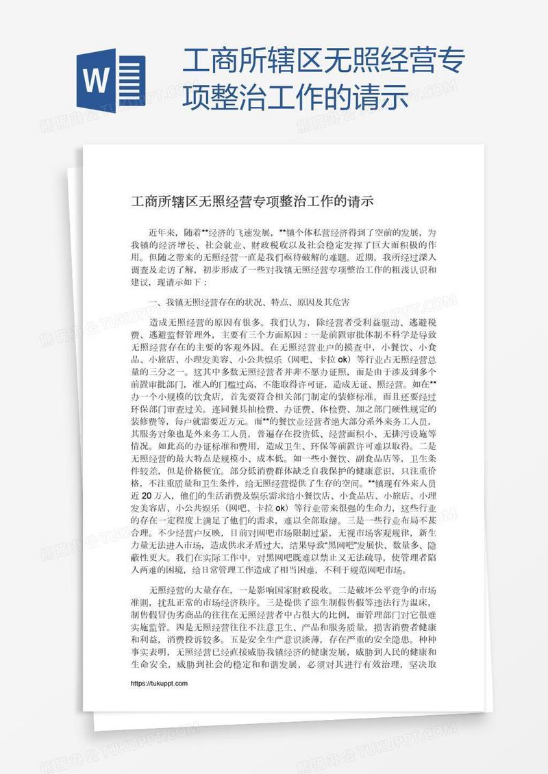 本作品为工商所辖区无照经营专项整治工作的请示, 编号:dawmkwgv41, 格式为 docx, 大小1 MB, 本作品下载后,先解压,解压之后用推荐软件 Word(2010) 打开, 然后进行编辑功能。