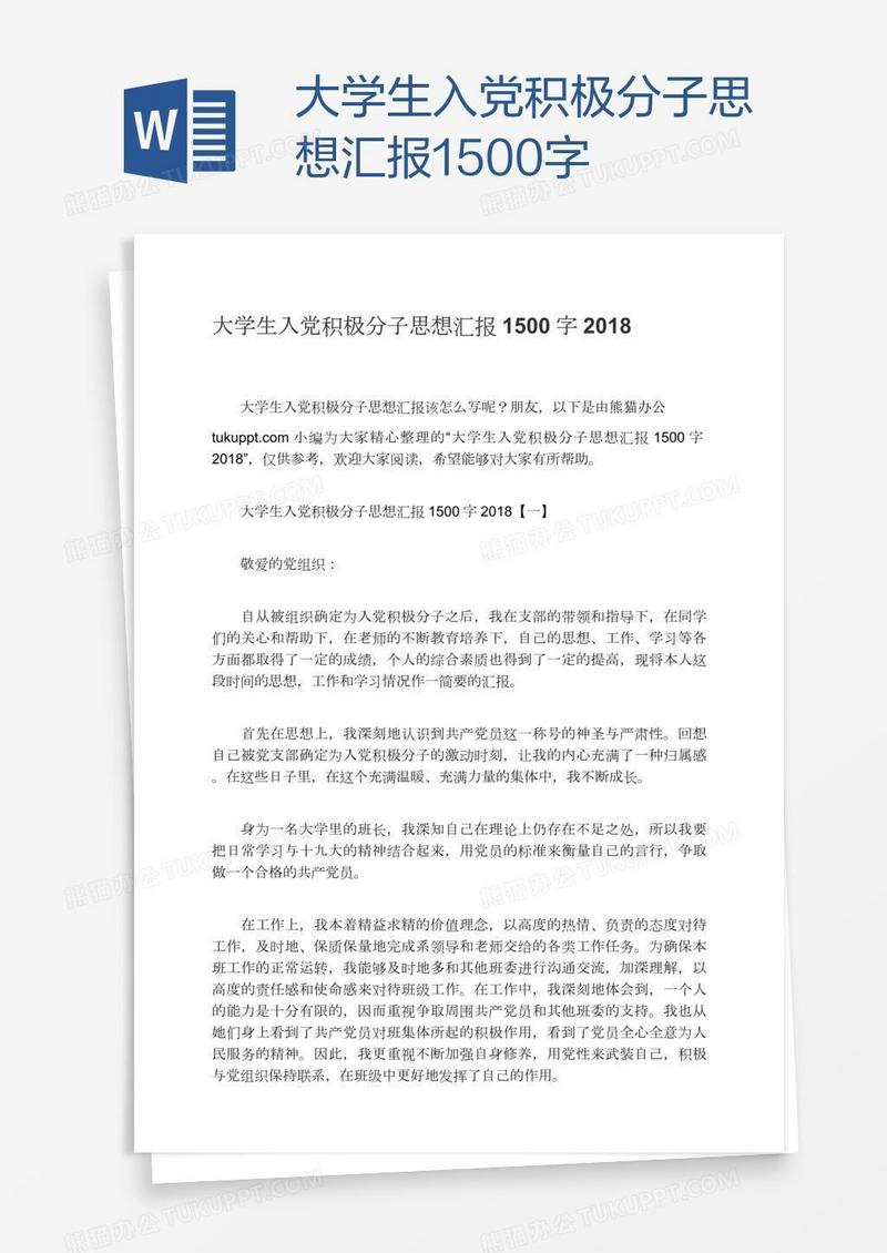 本作品为大学生入党积极分子思想汇报1500字, 编号:g9rv5opp41, 格式为 docx, 大小1 MB, 本作品下载后,先解压,解压之后用推荐软件 Word(2010) 打开, 然后进行编辑功能。