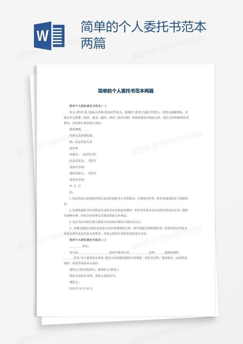 本作品为简单的个人委托书范本两篇, 编号:g9rv5rqvw1, 格式为 docx, 大小1 MB, 本作品下载后,先解压,解压之后用推荐软件 Word(2010) 打开, 然后进行编辑功能。