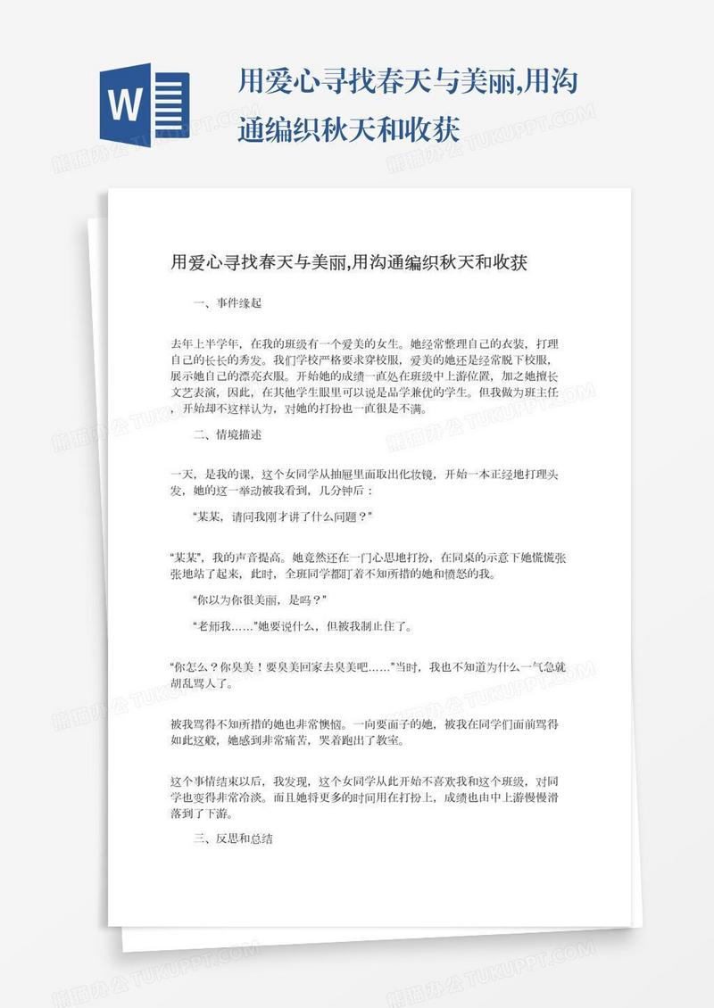 本作品为用爱心寻找春天与美丽,用沟通编织秋天和收获, 编号:g9rv654bj1, 格式为 docx, 大小1 MB, 本作品下载后,先解压,解压之后用推荐软件 Word(2010) 打开, 然后进行编辑功能。