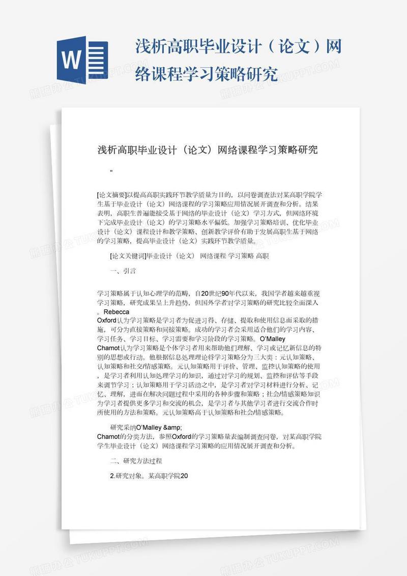 本作品为浅析高职毕业设计(论文)网络课程学习策略研究, 编号:g9rv6vly41, 格式为 docx, 大小1 MB, 本作品下载后,先解压,解压之后用推荐软件 Word(2010) 打开, 然后进行编辑功能。