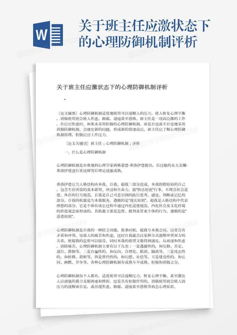 本作品为关于班主任应激状态下的心理防御机制评析, 编号:g9rvb0pv41, 格式为 docx, 大小1 MB, 本作品下载后,先解压,解压之后用推荐软件 Word(2010) 打开, 然后进行编辑功能。
