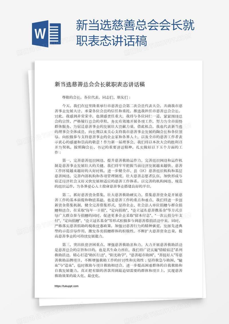 本作品为新当选慈善总会会长就职表态讲话稿, 编号:g9rvbmpjl1, 格式为 docx, 大小1 MB, 本作品下载后,先解压,解压之后用推荐软件 Word(2010) 打开, 然后进行编辑功能。
