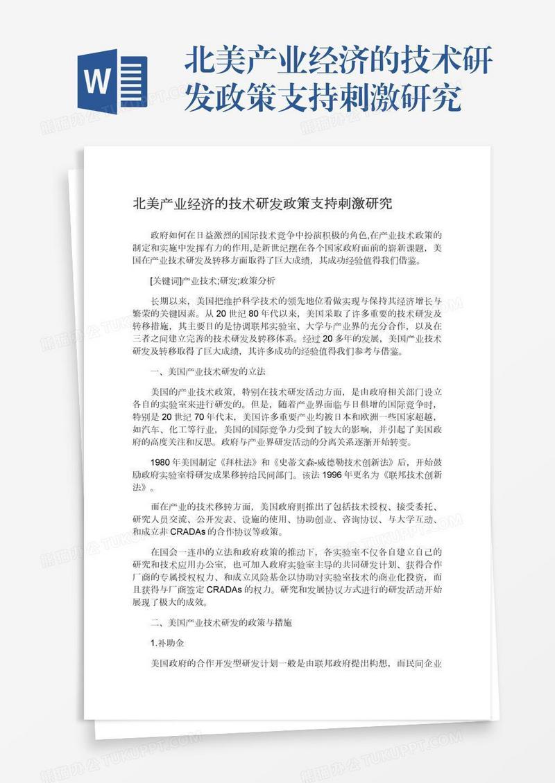 本作品为北美产业经济的技术研发政策支持刺激研究, 编号:g9rvbo7m31, 格式为 docx, 大小1 MB, 本作品下载后,先解压,解压之后用推荐软件 Word(2010) 打开, 然后进行编辑功能。