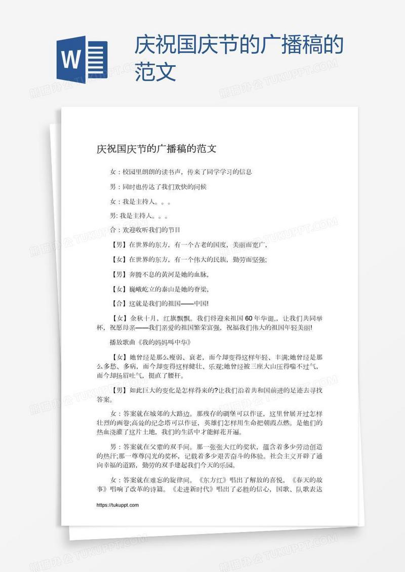 本作品为庆祝国庆节的广播稿的范文, 编号:g9rvbvm641, 格式为 docx, 大小1 MB, 本作品下载后,先解压,解压之后用推荐软件 Word(2010) 打开, 然后进行编辑功能。