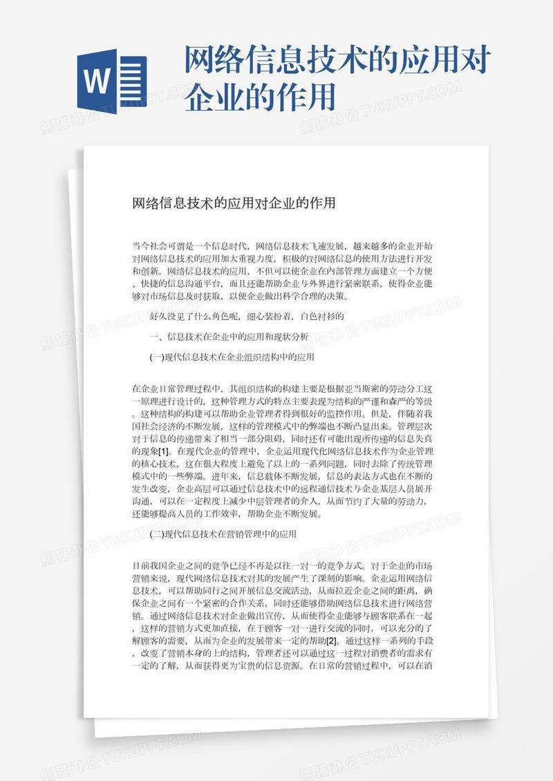 本作品为网络信息技术的应用对企业的作用, 编号:k1b272l6d1, 格式为 docx, 大小1 MB, 本作品下载后,先解压,解压之后用推荐软件 Word(2010) 打开, 然后进行编辑功能。