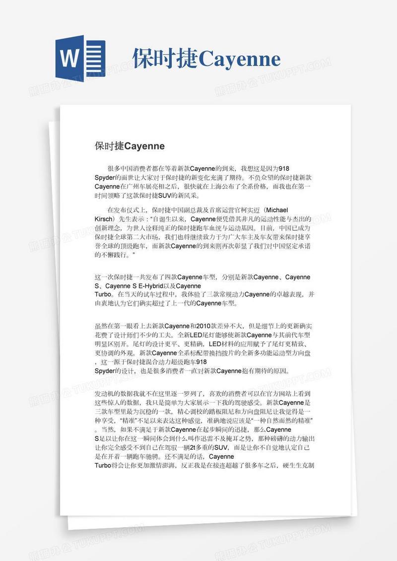 本作品为保时捷Cayenne, 编号:k1b277eop1, 格式为 docx, 大小1 MB, 本作品下载后,先解压,解压之后用推荐软件 Word(2010) 打开, 然后进行编辑功能。