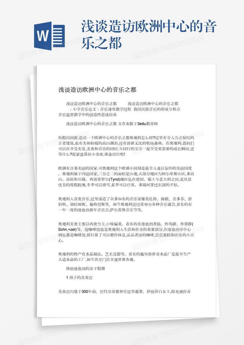 本作品为浅谈造访欧洲中心的音乐之都, 编号:k1b27m2eb1, 格式为 docx, 大小1 MB, 本作品下载后,先解压,解压之后用推荐软件 Word(2010) 打开, 然后进行编辑功能。