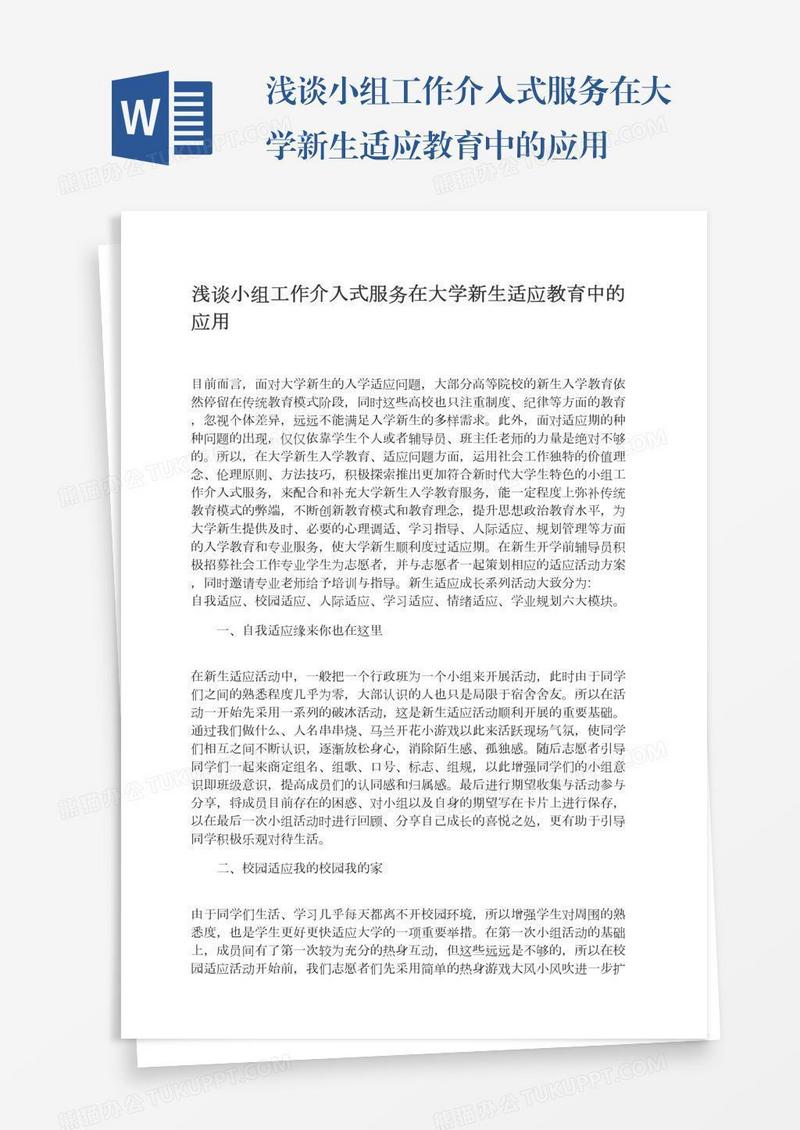 本作品为浅谈小组工作介入式服务在大学新生适应教育中的应用, 编号:k1b27m5681, 格式为 docx, 大小1 MB, 本作品下载后,先解压,解压之后用推荐软件 Word(2010) 打开, 然后进行编辑功能。