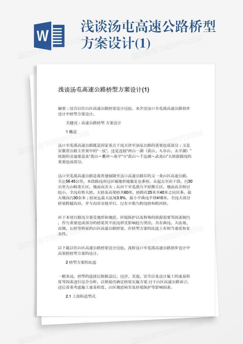 本作品为浅谈汤屯高速公路桥型方案设计(1), 编号:k1b27rr5b1, 格式为 docx, 大小1 MB, 本作品下载后,先解压,解压之后用推荐软件 Word(2010) 打开, 然后进行编辑功能。