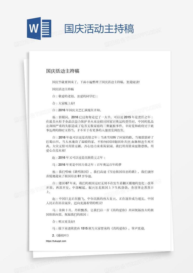 本作品为国庆活动主持稿, 编号:k1b2k437m1, 格式为 docx, 大小1 MB, 本作品下载后,先解压,解压之后用推荐软件 Word(2010) 打开, 然后进行编辑功能。