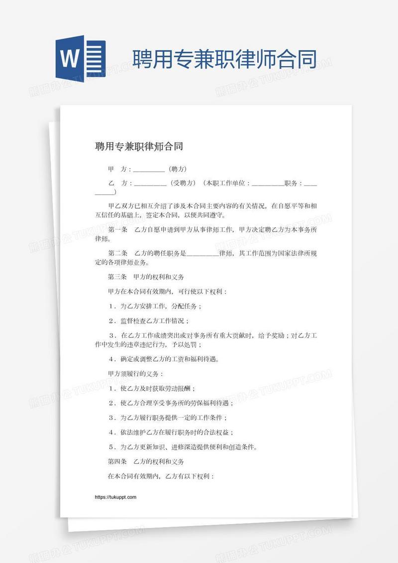 本作品为聘用专兼职律师合同, 编号:k1b2kdqjb1, 格式为 docx, 大小1 MB, 本作品下载后,先解压,解压之后用推荐软件 Word(2010) 打开, 然后进行编辑功能。